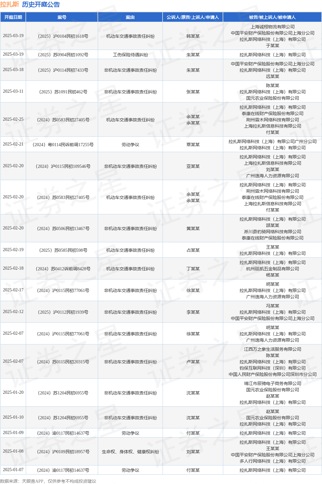 案号:(2025)苏0585民初598号审理法院:太仓市人民法院案由:机动车交通事故责任纠纷当事人信息: 原告/上诉人:占某某 被告/被上诉人:王某某、拉扎斯网络科技(上海)有限公司开庭日期:2025年2月19日根据统计,近一年内以拉扎斯网络科技(上海)有限公司为当事人的历史开庭公告有175则,其中案由为“非机动车交通事故责任纠纷”的公告以73则居首,其次为“劳动争议”有33则,“工伤保险待遇纠纷”有28则。历史开庭公告(前20条)如下: